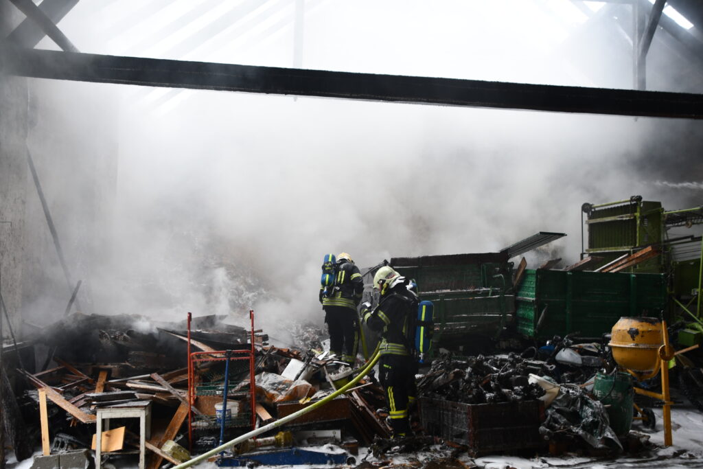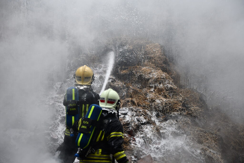 Zum kompletten Ablöschen der letzten Glut- und Brandherde wird das Brandgut zerteilt und in weiterer Folge abgelöscht. Die Nachlöscharbeiten werden noch einige Zeit in Anspruch nehmen.