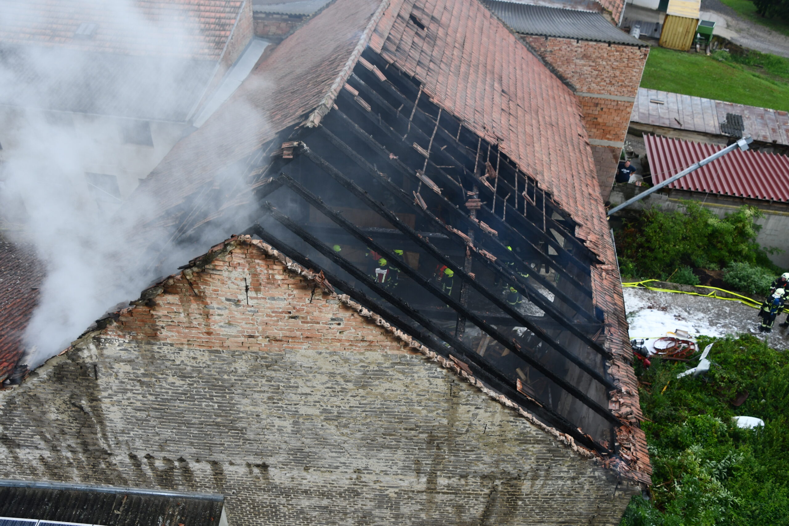 Zum kompletten Ablöschen der letzten Glut- und Brandherde wird das Brandgut zerteilt und in weiterer Folge abgelöscht. Die Nachlöscharbeiten werden noch einige Zeit in Anspruch nehmen.