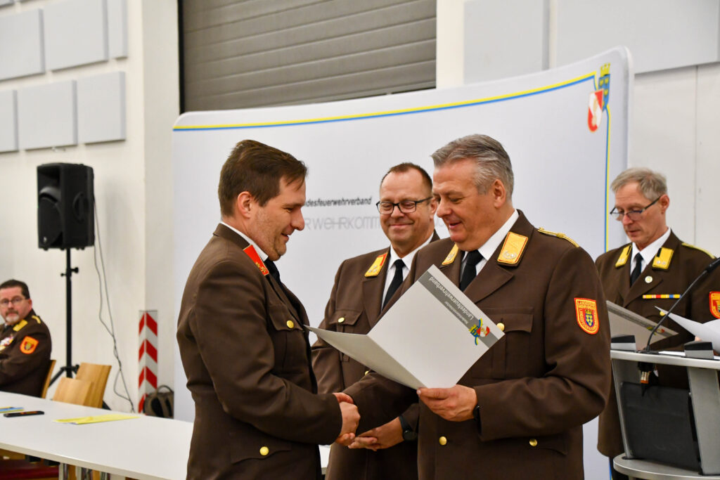Landesfeuerwehrkommandant LBD Dietmar Fahrafellner (l) bei der Überreichung der Urkunde an BR Michael Berger (r)